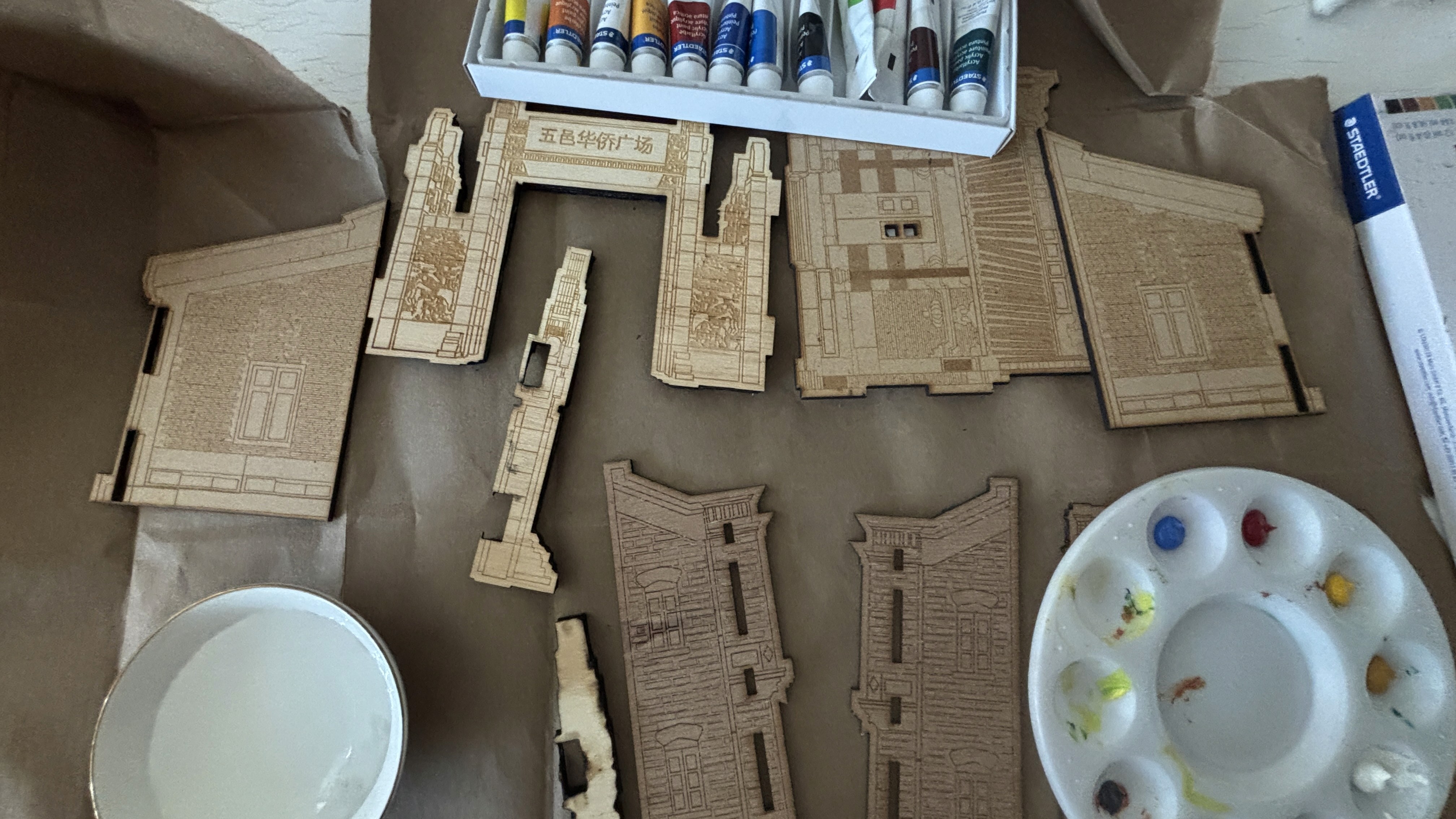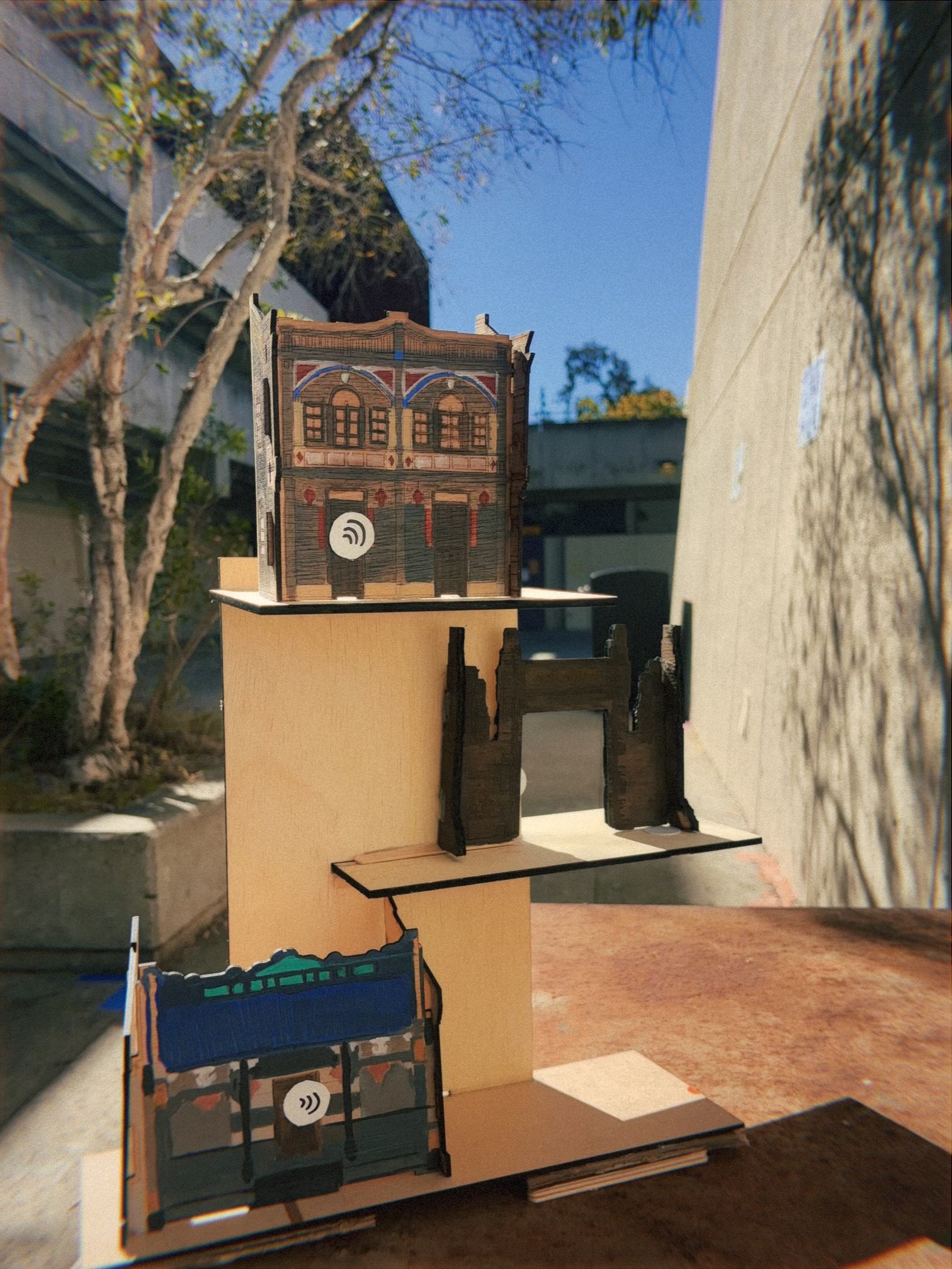 A visual representation of the physical exteriors of locations from Jiangmen, and digital pixel objects from memories. Users are able to visualize the laser cut wooden buildings, and tap on the connected NFC tags to visualize a lego version of the interior items.