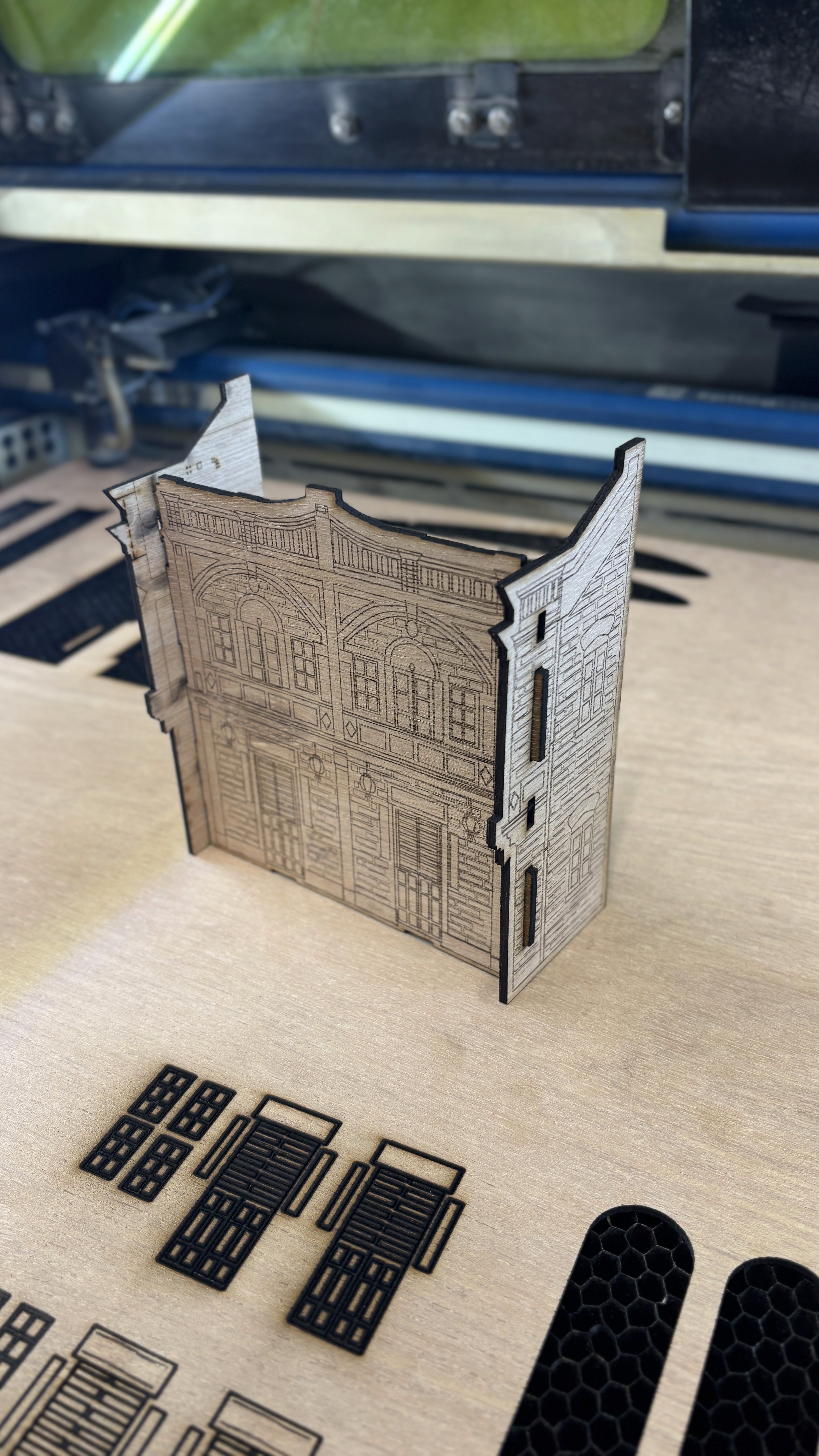 Once vectorized, the svg files are then transferred to the laser cutter, where partial of the patterns are engraved and the other parts are solid cuts. Slots were made to ensure the buildings were to stand upright.